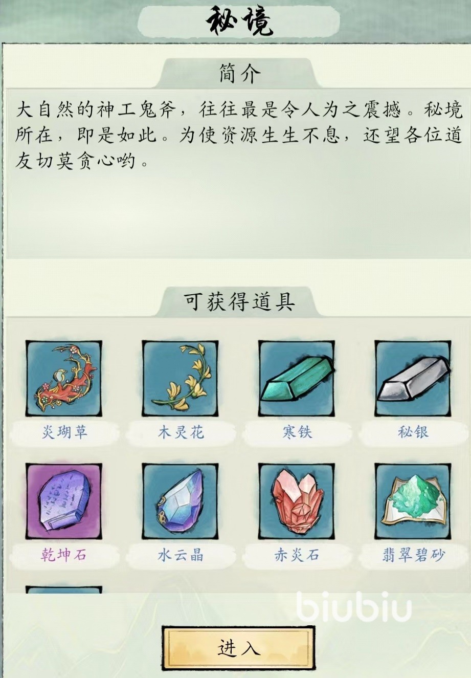 在青神秘境中主要掉落是各种灵花和灵草,例如炎瑚草、木灵花等,对应在洞府中的炼丹活动,都是所必需基础资源。天工秘境中所推出的主要有寒铁和密银这两种道具,应用在练器活动中。赤阳秘境中出现的有水云晶,赤岩石,天河朱砂和翡翠碧沙,这些道具既不用于炼丹,也不用于炼器,但是可以用于提升丹火等级。丹火却是以上两种炼制活动必须道具,越是高级丹药和装备越需要顶级丹火。最后的须弥秘境中出产的道具只有一种,就是乾坤石,是用于主角和道侣装备强化,和战力相关最为紧密。