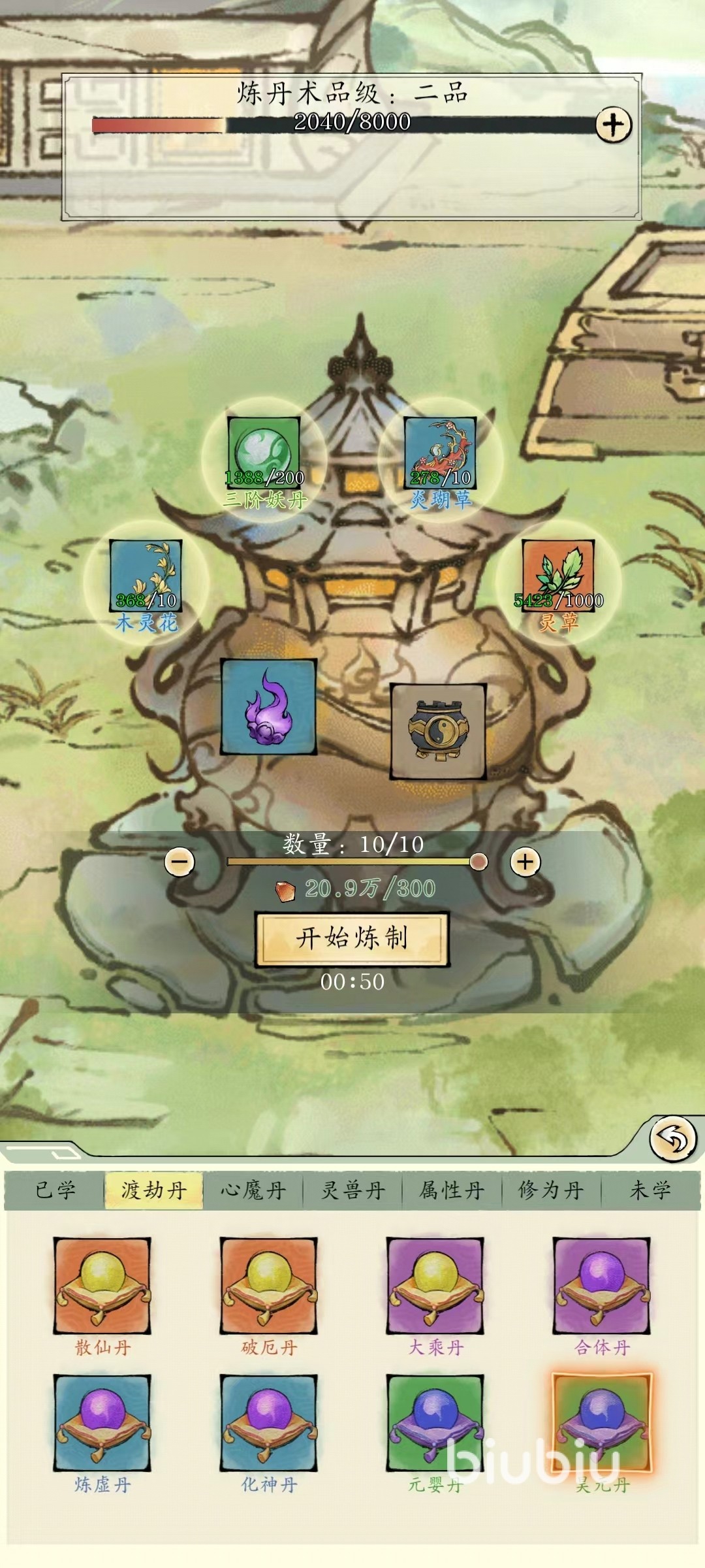 炼丹需要资源绝大多数都可以在秘境中获得,平时也要注意积累,这样快速冲击时候直接拿来就能使用。当所能使用的属性丹全部达到饱和之后,接下来再想冲击小编推荐多炼制一些渡劫丹。后期每失败一次都要都要损失大量修为,也需要时间去弥补,提高几率就有助于快速突破。