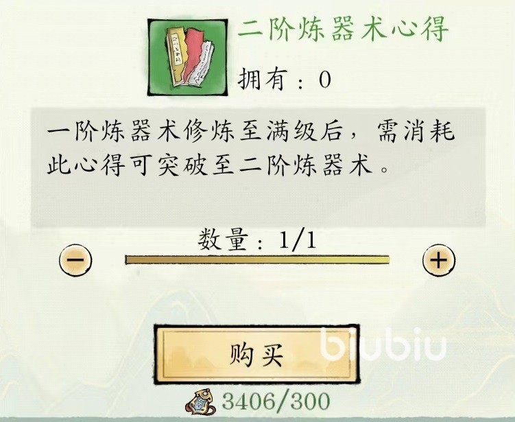 为了始终保持高经验获取,建议随时更新炼制图纸,始终保持比较高阶程度。当通过各种渠道获得经验将进度条填满之后,接下来需要去购买对应炼器术心得。如果想要从一阶突破到二阶,就要购买二阶心得,往后也同样如此。需要注意的是心得和经验书不同,经验书能填满进度条,但是心得只能用于填满之后往上升,两种道具缺一不可。