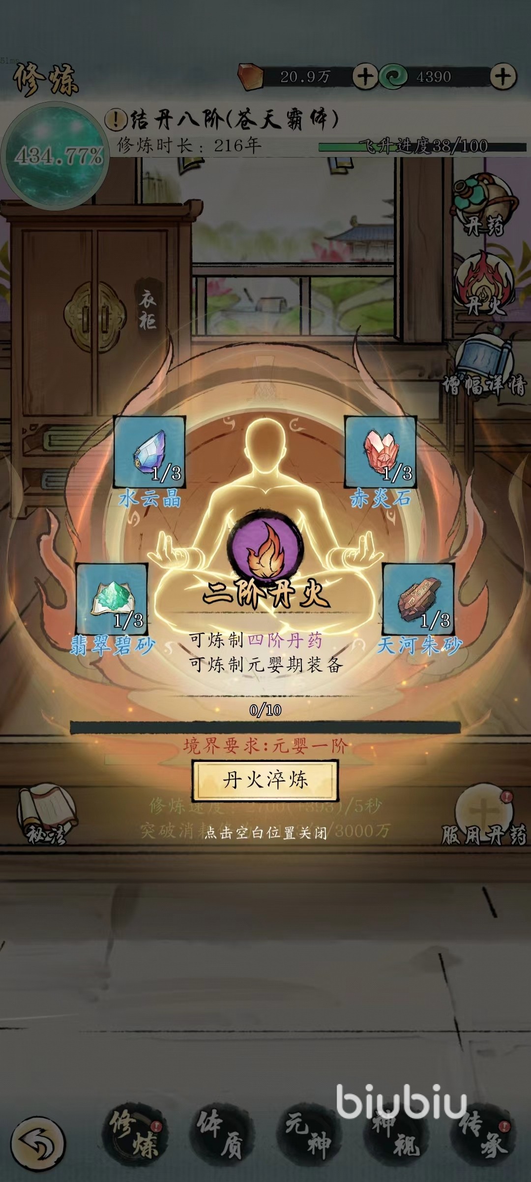 当大家在洞府中打开炼器或是炼丹之后,都会发现除了需要各种秘方之外,还有两项固定的道具就是丹火和炉子,虽然这两样练字需要的数字不同,但是单火是完全相同的。火焰的品质直接决定了炼制过程中的各项水准,在初级阶段只能获得一阶丹火,后续要想升级,需要在修炼中点击丹火项目进行提升。所需要道具主要有翡翠碧沙,水云晶,赤岩石和天河朱砂等。
