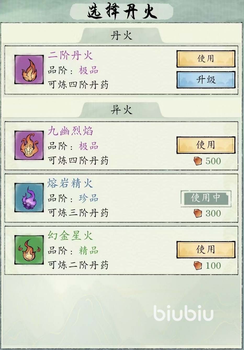 当然作为同步提升的项目,也要由于当前火焰相匹配的炉子,这样才能发挥出威力。此外除了普通火焰之外,还存在异火,目前开放的有九幽烈焰、熔岩精火和幻金星火这三大类。需要使用灵石购买,属于一次性玩法。这些异火能够起到更加出色效果,如果想要炼制出品质更高道具,建议直接选择。