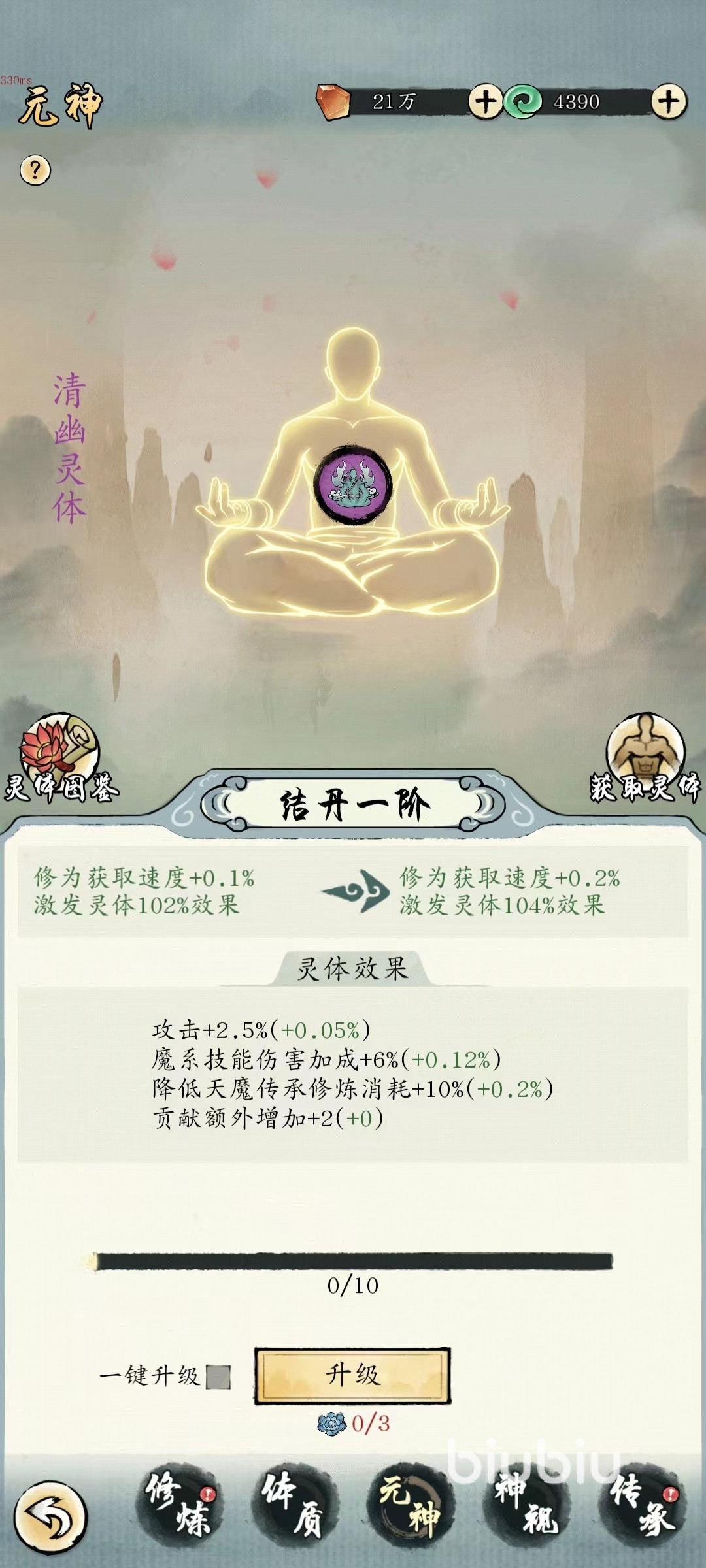 切换到元神之后可以在上方自由选择当前使用哪种灵体,不同种类所能附加属性加成有很大区别,接下来还能消耗碧髓花进行升级,元神等级和灵体相辅相成,元神等级越高所激发出来灵体效果也会越强。直接在旁边点击获取灵体,就可以切换到直接抽取。在所有类型中,小编推荐使用的有混沌、应劫,这两个属于通用类型,其他所提升仅仅是单一伤害,例如剑虚灵体提高剑系伤害,九幽灵体的降低天魔传承修炼消耗,都只适合不同的门派。