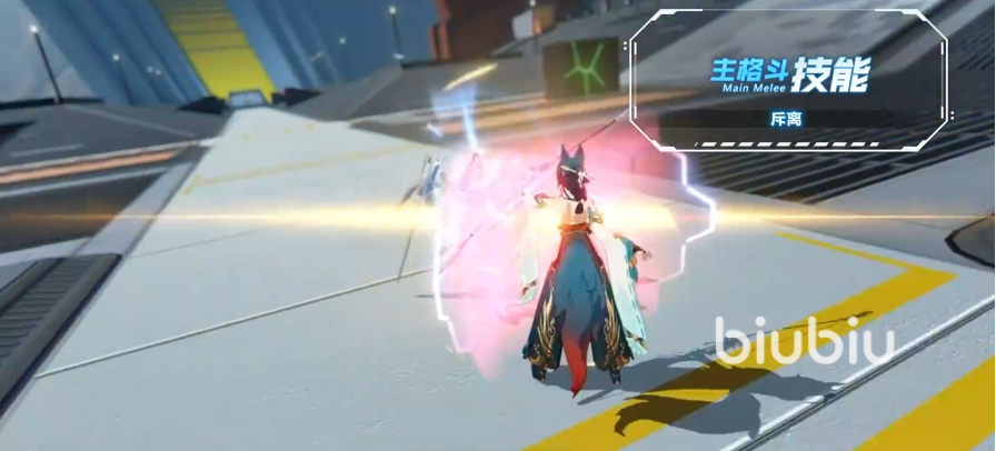 主格斗技能“斥离”,使用后空翻踢击拉开身位,并发箭牵制敌人,配合前方向键,以凌厉的飞踢攻击敌人,随后射出箭矢压制对手,使用左右方向键,则挥舞大弓发动三段重劈,随后发动连射;再配合方向键,会转身使用尾巴进行嘲讽,敌人上当后使用格斗技能攻击。