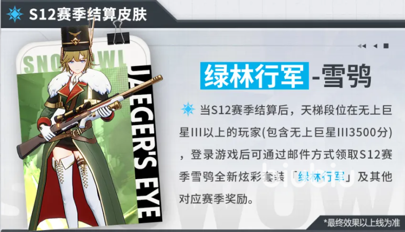 新皮肤:S12赛季结算皮肤“绿林行军·雪鹄”,天梯段位在无上巨星III以上的玩家,都能通过邮件领取到这个炫酷的皮肤,还有其他对应赛季奖励。S13赛季通行证皮肤“夏普·休息时间”,整体是个睡衣套装,非常可爱。