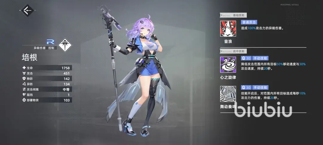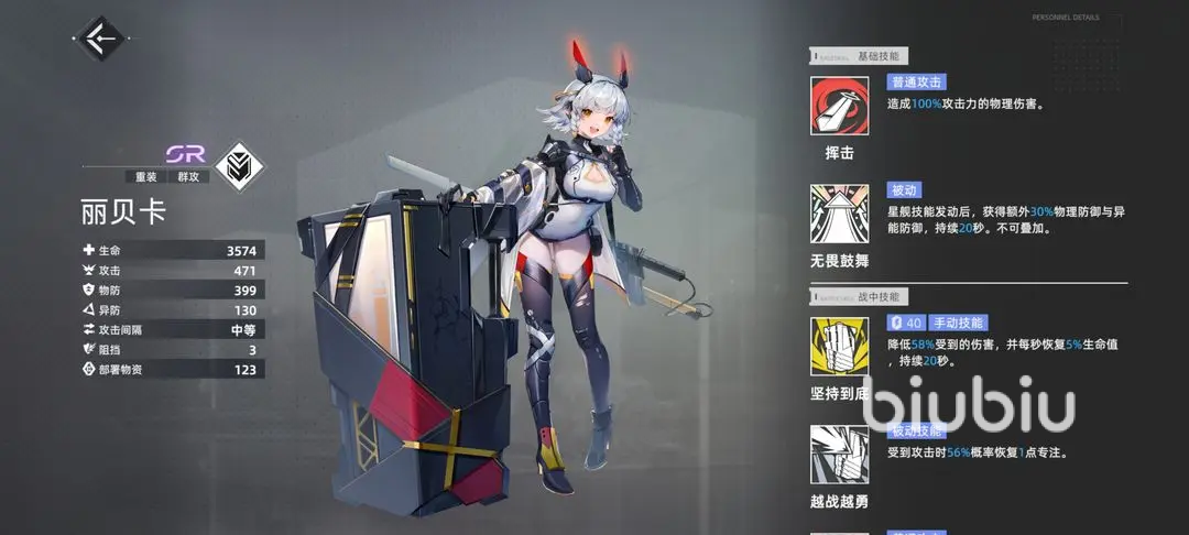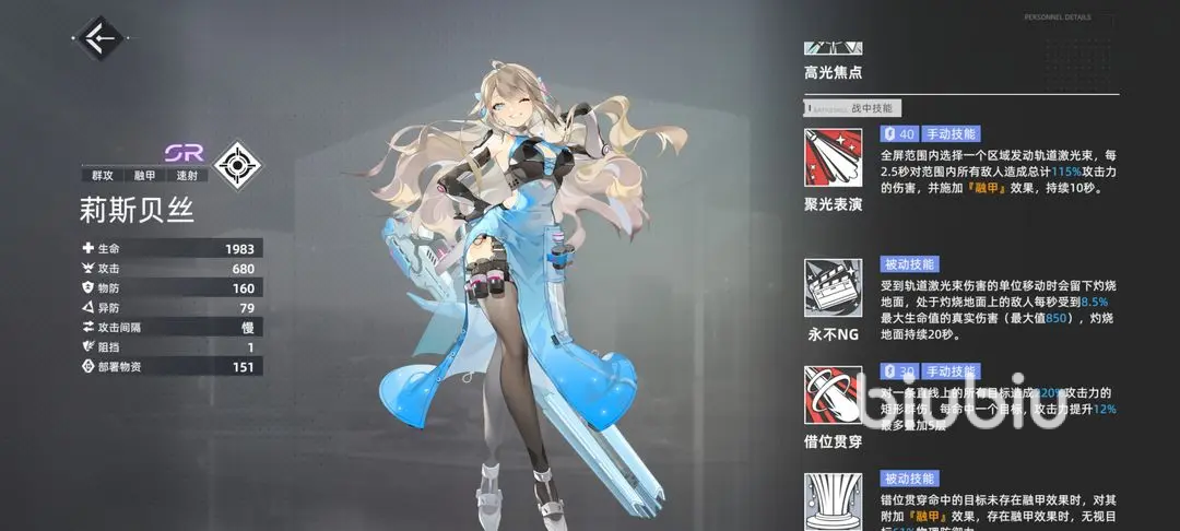 丽芙是一个消耗非常低的,用来部署物资的一个角色,在每局开始的时候其实就能用她,因为她开箱子的能力很强,技能也是很实用,能够来得到物资的,所以用她来过渡也是在合适不过的了。自动狙击是她的基础技能,能够对对手造成100%攻击的物理伤害,作为射手来说这个技能的伤害也还是比较可观的,战中技能就比较优秀了,名叫回本买卖,技能使用之后能够立即获得9点的部署资源;意念爆发还能够对她的专注力回复10点,是性价比的非常高的一个角色,低投资,高收益。