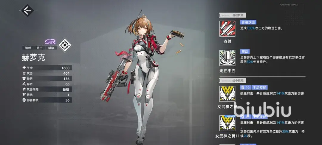 赫萝克这个角色具有非常优秀的清杂的能力,开启大招之后抛光的速度非常快,可以说是SR当中的战神吧,将她作为主力来使用都是没有问题的,好好培养,不用替代她的那种。普通攻击就能够拥有100%的攻击力,对对手造成物理伤害,无往不胜是被动,能够在她自身上下左右四个位置进行部署,如果周围没有队友的情况下,她的伤害能够提升30%,所以她这个技能在进行部署的时候,一定要看准部署的位置,尽量和队友离得远一点,这样能够提升伤害。