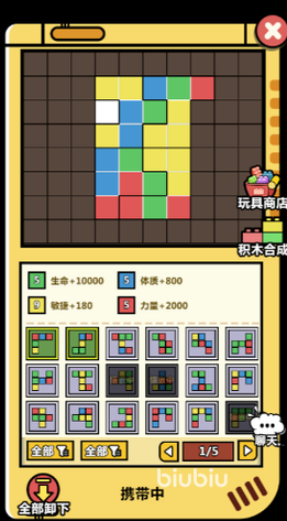 首先是合成,玩具合成可以说是一个操作起来相当复杂的系统了,很多玩家在第一次打开玩具合成的时候估计会傻眼,游戏中的合成页面是一个类似拼图的页面,在该页面中会有很多积木模块,这些积木模块可以组合成玩具,玩家需要将拥有的积木模块进行拼接,在限制范围内拼出一个完整的玩具。