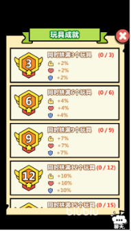 最后是玩具成就,大家可以将其理解成一种任务,在成就页面中可以看到很多有关玩具的任务要求,大家只需要完成这些要求,比如用积木拼装三个玩具,用积木拼装六个玩具,完成这些任务要求之后大家就能解锁成就了,解锁之后就能获得属性百分比加成。