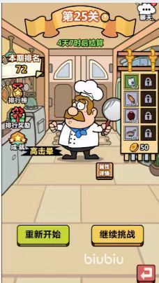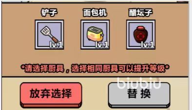 继续挑战界面是各位玩家小伙伴们获得厨房用具的重要来源,玩家小伙伴们可以对厨师发起挑战,挑战获得胜利以后就会得到相应的奖励,奖励包括一些金币和三个从厨具。而且玩家们在获取胜利以后,就可以在弹出的三个厨房用具页面中,选择想要替换掉的厨房用具,点击“替换”按钮就能够替换厨房用具。