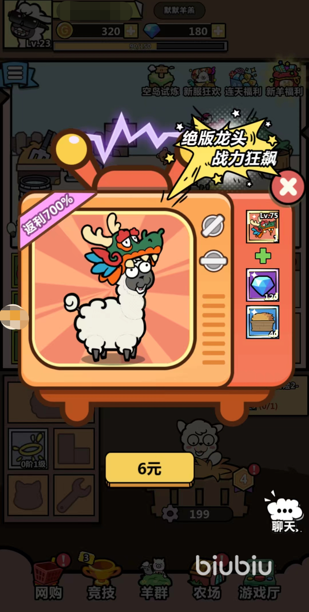 1、新羊福利:这个其实就是其他游戏中的六元首冲,可以得到一个稀有的“头饰”、120钻石、40草垛。头饰的属性还是比较不错的,如果大家是在新区的话,是比较推荐大家拿一个首冲的,这个头饰让大家前期打竞技场和过关卡的时候会非常舒服。