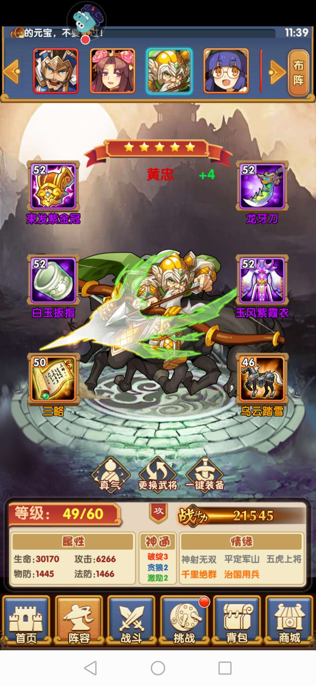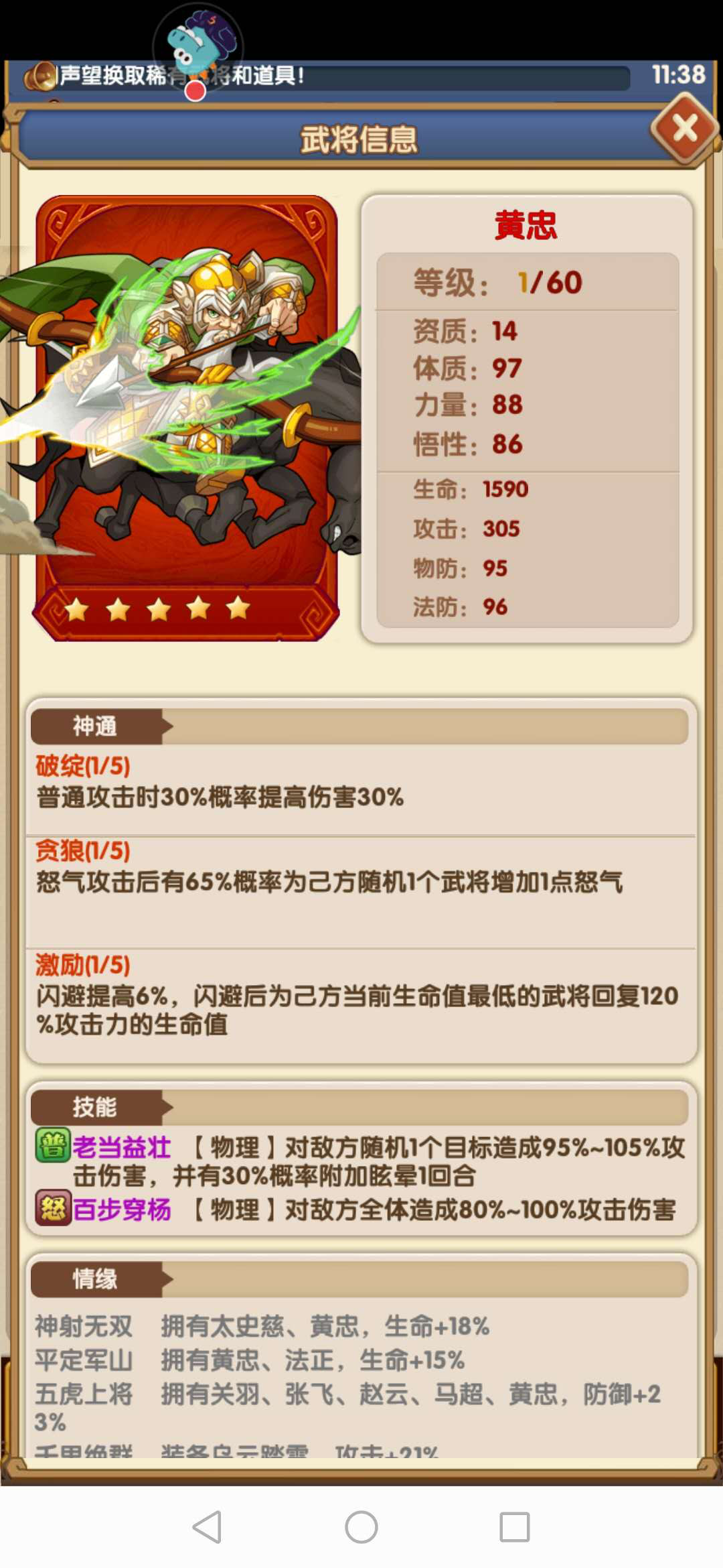 第三个是老将黄忠,黄忠是限时商城中VIP1级就可以购买的武将,价格2000元宝,在前期大家都可以买得起,黄忠的技能百步穿杨同样是群攻技能,神通技能破绽、贪狼和激励都是神技。破绽可以在自身攻击后有一定概率提升下一次攻击的伤害,贪狼是可以为己方其他武将恢复怒气,激励可以提高自身的闪避,并且在闪避后为友军恢复生命值。
