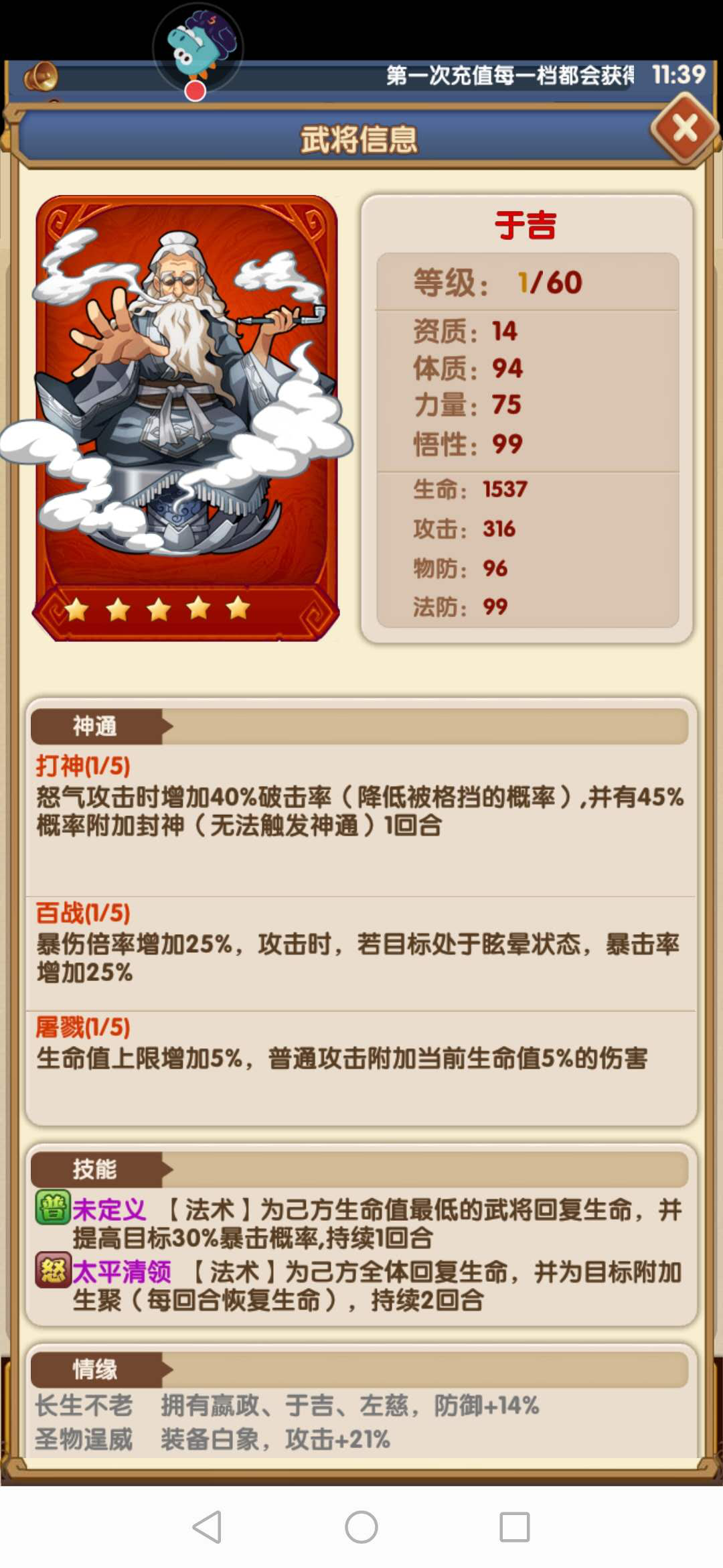 第四个是于吉,于吉是红色治疗类武将,普通技能可以对我方单体武将恢复血量,并且提升自己的技能暴击率,怒气大招太平清领,可以恢复全体上阵武将的血量,并且施加一个持续回血的BUFF,持续2回合。于吉的治疗能力在所有治疗武将中都是数一数二的,新手玩家因为装备不齐等原因在前期非常脆弱,而且在闯关和推图的时候有一个好的治疗武将能够走得更快更远。