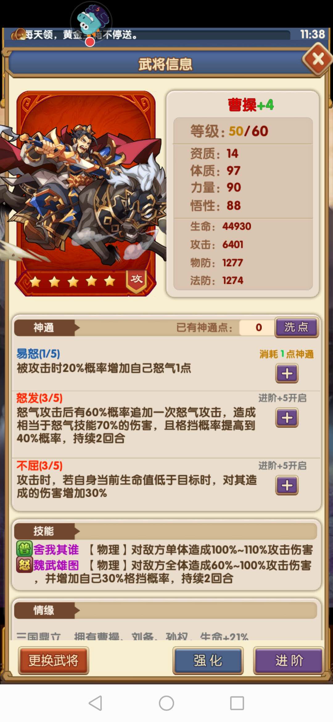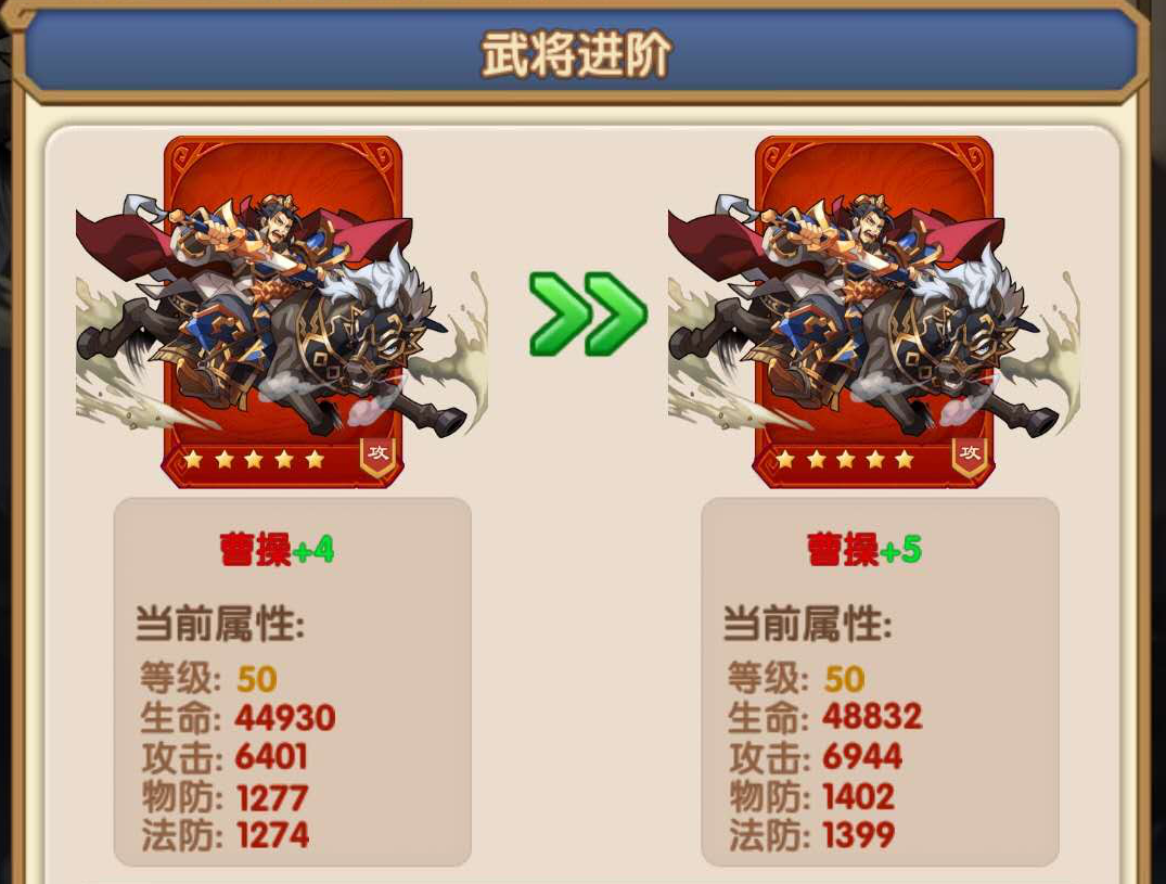 小编推荐的第一个红色武将就是曹操,曹操是系统赠送的第一个红色武将,入手非常简单,曹操的神通和技能也非常适合新手,技能魏武雄图可以对敌方造成群体伤害,而且神通怒发还有一定的几率追加一次怒气技能,并且提高自身的格挡几率。只要好好培养,曹操在前期可以说是队伍里的绝对主力,在推图或是打副本的时候都有很好的表现。