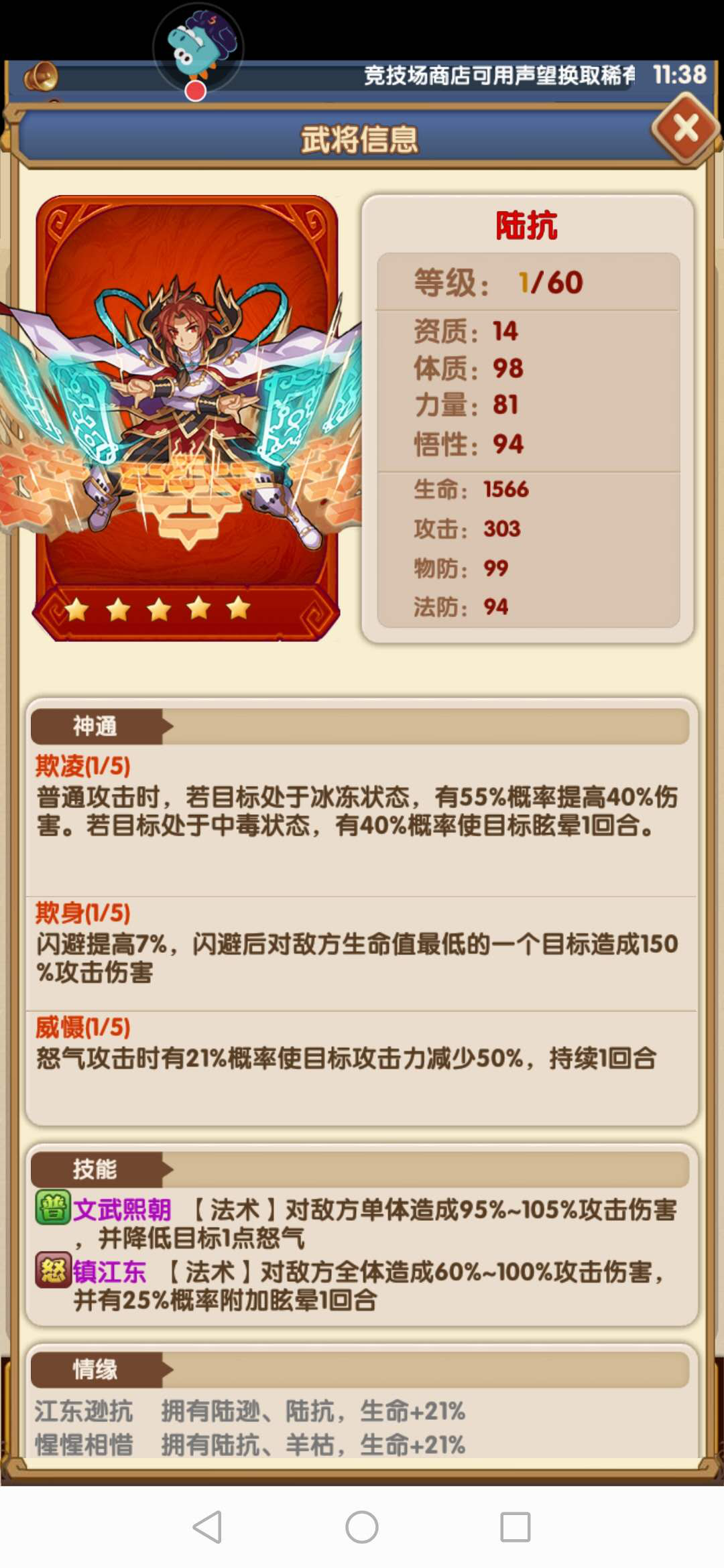 第二个推进的红色武将是陆抗,陆抗是首充大礼包中的武将,也是一名群体伤害非常高的武将,技能镇江东可以对敌方全体造成伤害并且有25%的概率眩晕目标,神通技能威慑,在怒气技能造成伤害的同时还可以降低目标的攻击力,变相的增加己方的生存能力。