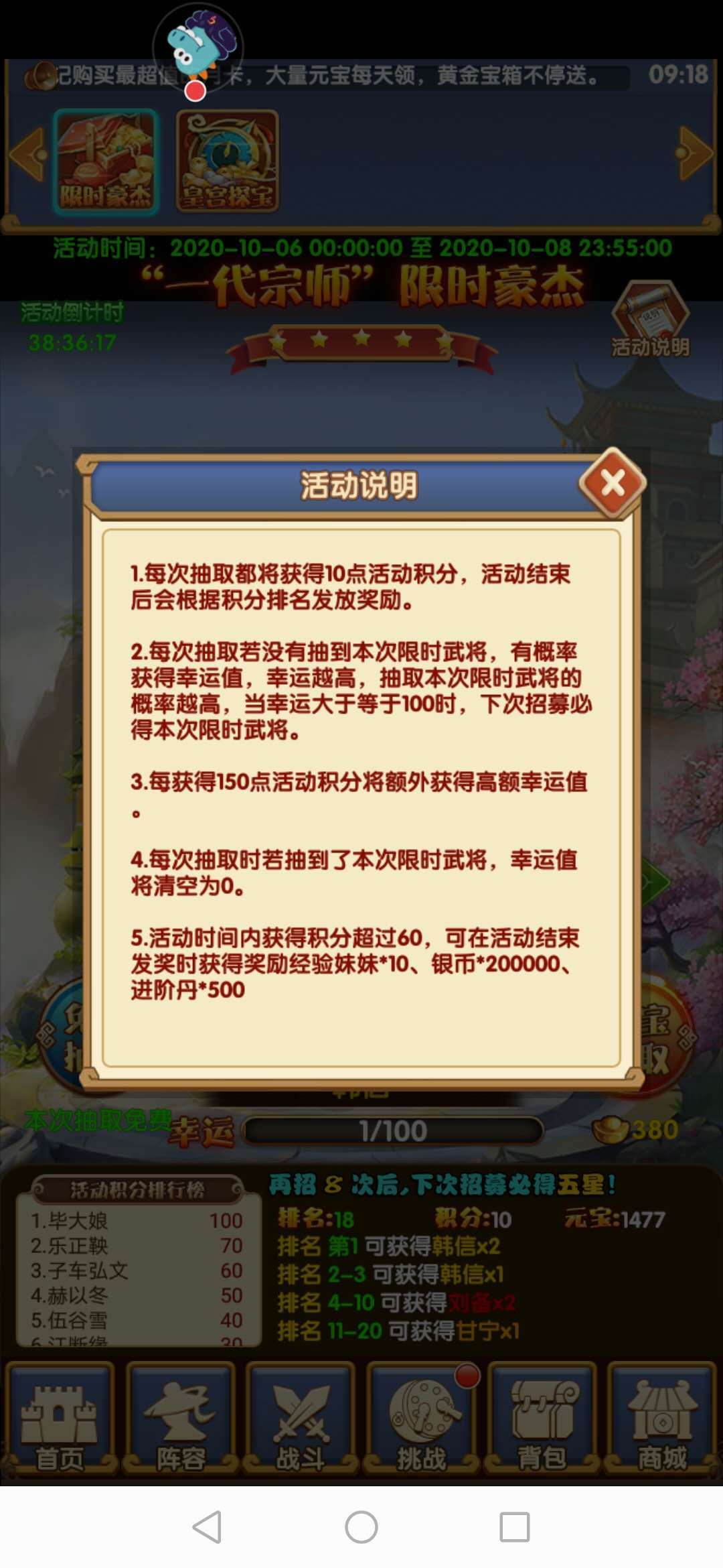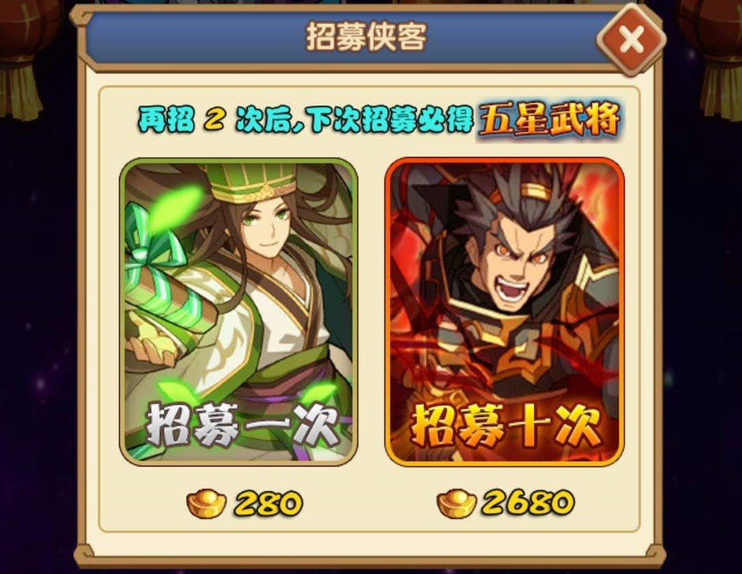 第三个方法就是酒馆招募,点击界面上的商城选项,选择其中的橙色招募功能,就可以进行抽奖了,每抽10次必定会出现一名红色五星武将,小编建议大家攒够抽10次的元宝之后进行10连抽,这样性价比比较高。