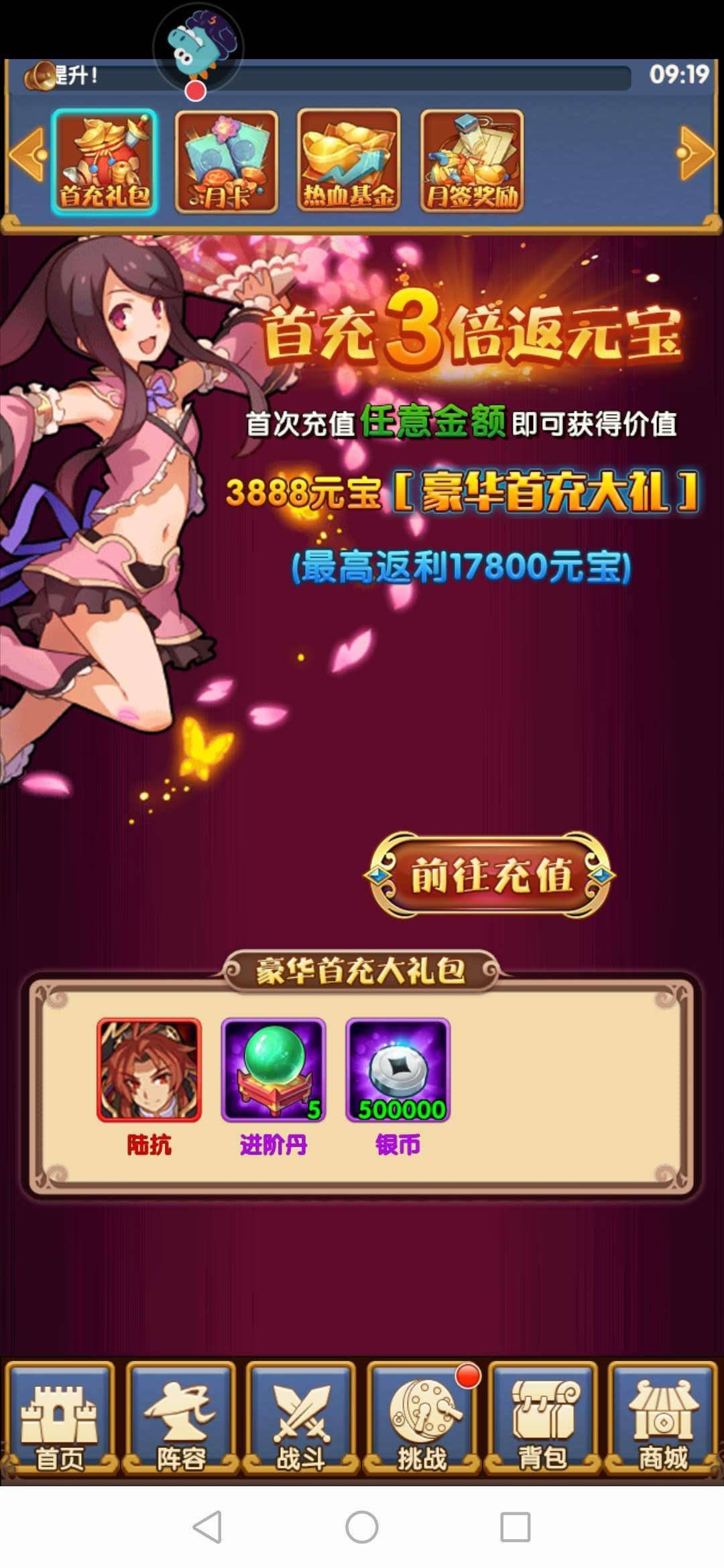 第二个方法是通过充值礼包来获得,在界面上选择首充三倍选项,在其中充值任意金额就可以得到礼包,小编建议大家选择一个月卡充值,这也不仅可以免费获得礼包,还能每天获得月卡收益。礼包奖励的红色武将是陆抗,陆抗是一名群体伤害武将,并且攻击附带愤怒,是前期推图的理想选择。