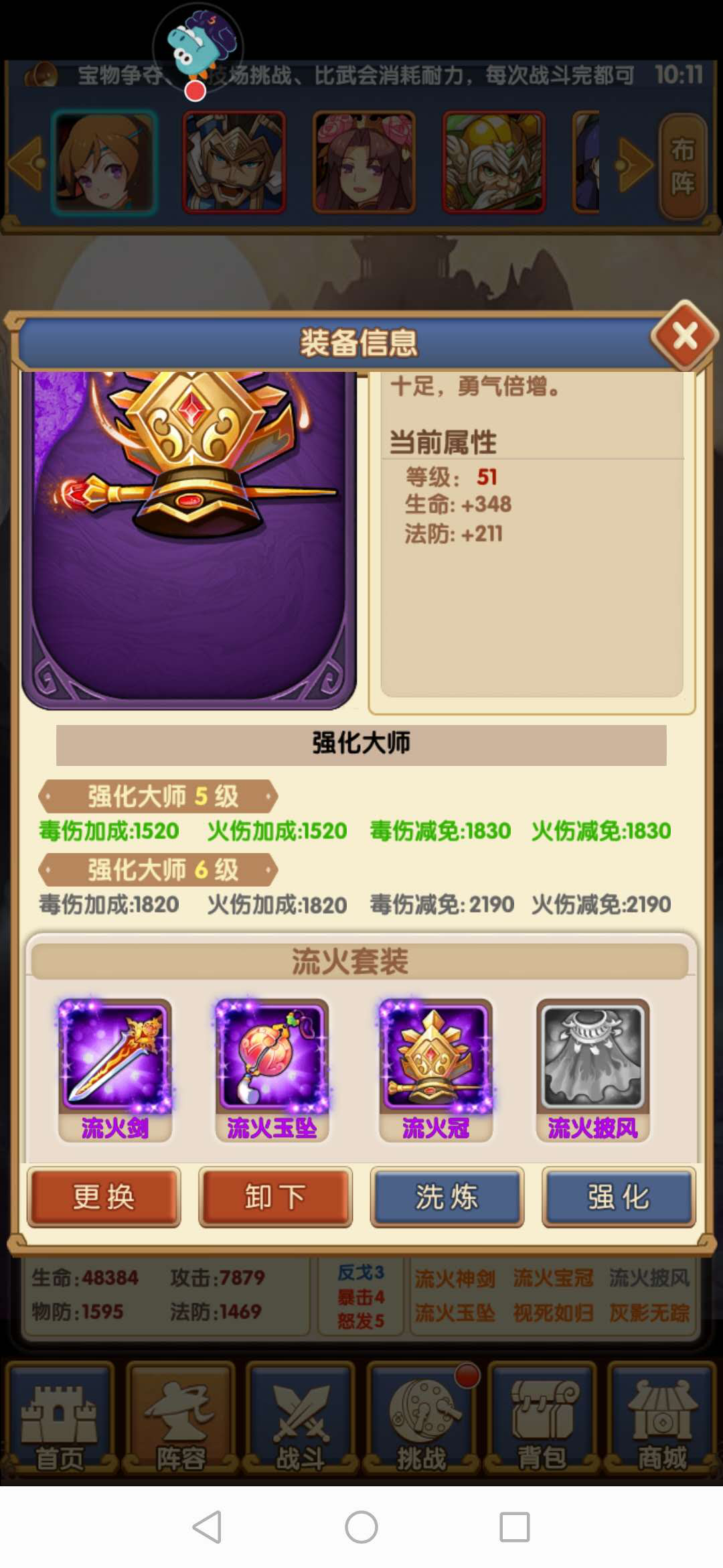 需要注意的是主角在装备的选择上有区别,因为主角在穿戴流火套装后可以激活自身的情缘,额外增加属性,所以就算是到了后期主角依然不会选择其他装备。