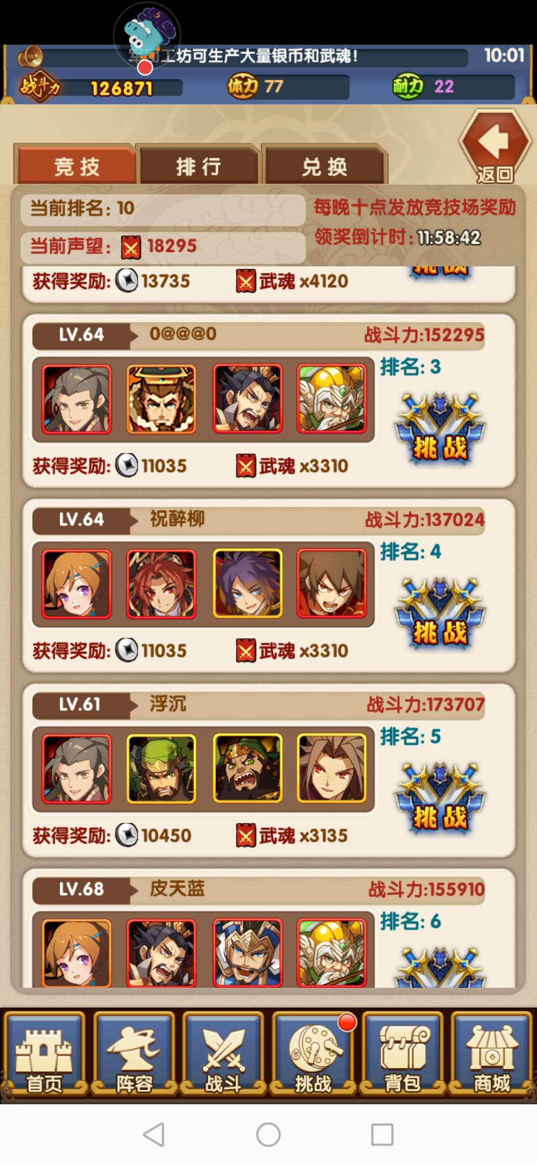 第三个方面就是竞技场了,竞技场和比武最大的不同就是竞技场有一个排名奖励,在竞技场中花费2点精力对排名比我们高的玩家进行挑战,胜利后就能取代对手的排名,排名越高获得的声望越高,声望用来兑换高级马匹和马匹升级材料非常划算。