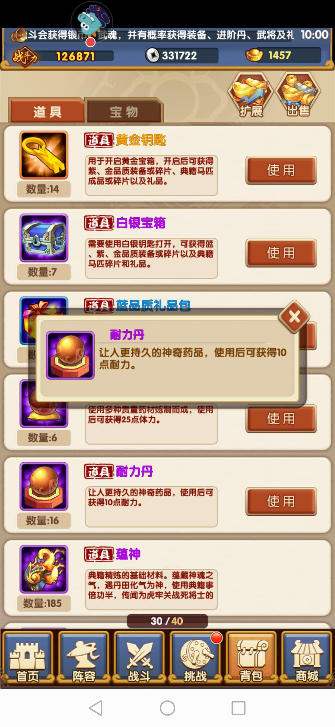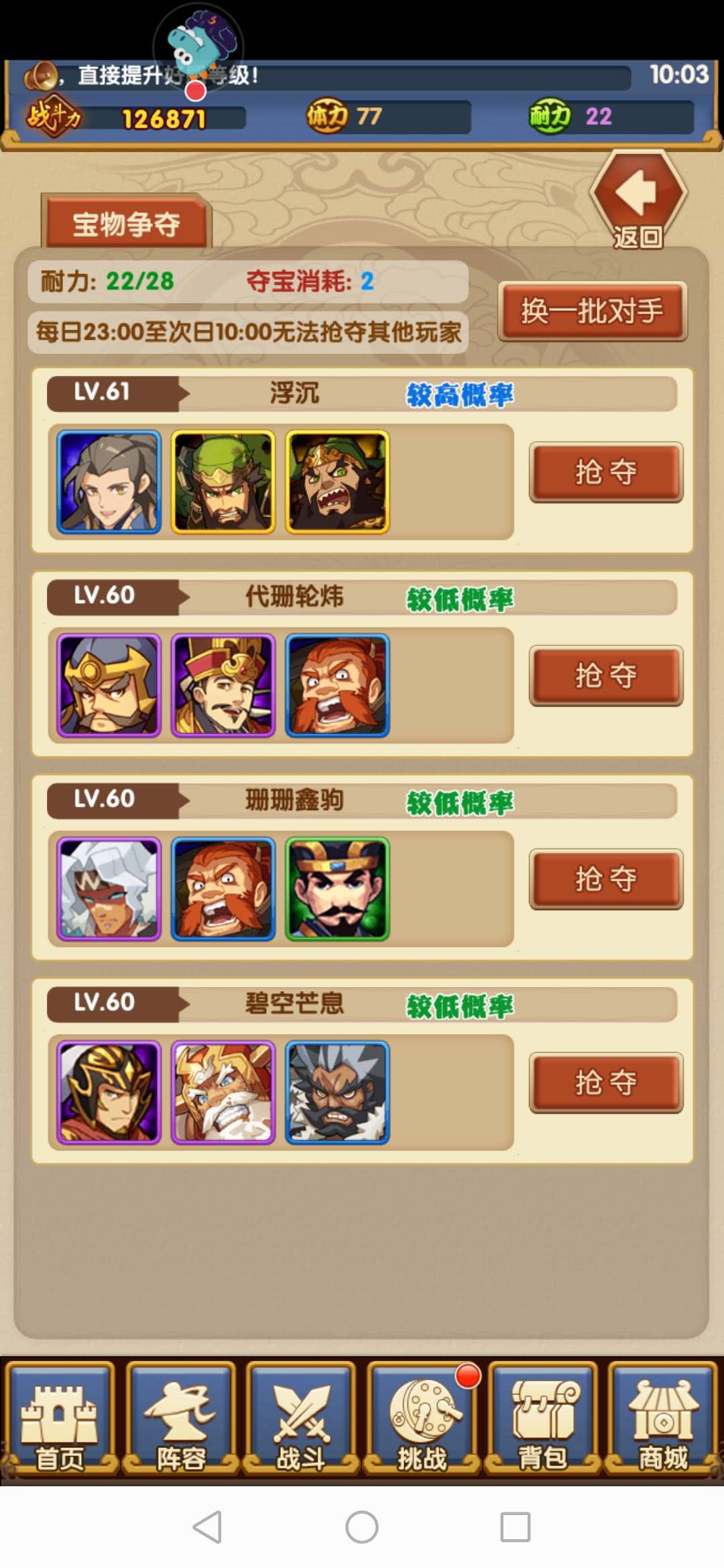 第二个用处就是比武活动,比武中玩家可以根据自己的实力来选择合适的对手,挑战成功后获得一定的积分,每次挑战需要消耗2点精力,和夺宝一样,无论战斗胜利与否都可以进行一次抽奖,而且只要对手选择好,胜利的几率还是较大的。比武可以获得大量荣誉,用来兑换各种橙色宝物和装备,也是高级装备获取的一大来源。