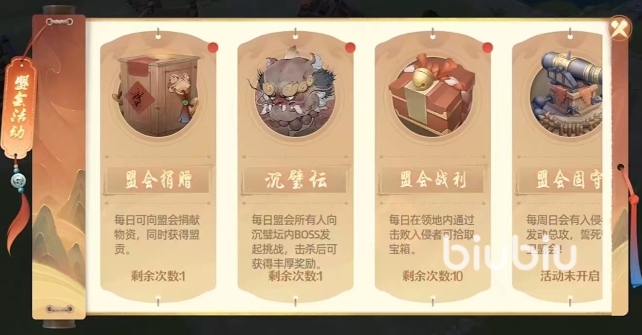 盟会战利指的是每天在领地中可以发现入侵者,将这些入侵者击败,可拾取宝箱,每天能够完成10次。沉壁坛是打BOSS活动,每天都可以挑战,击杀后获得奖励。盟会固守活动是每周日会有入侵者发动总攻,保卫盟会可获得丰厚奖励。这些活动都是盟会玩法的重要组成部分,每天都要记得参加。