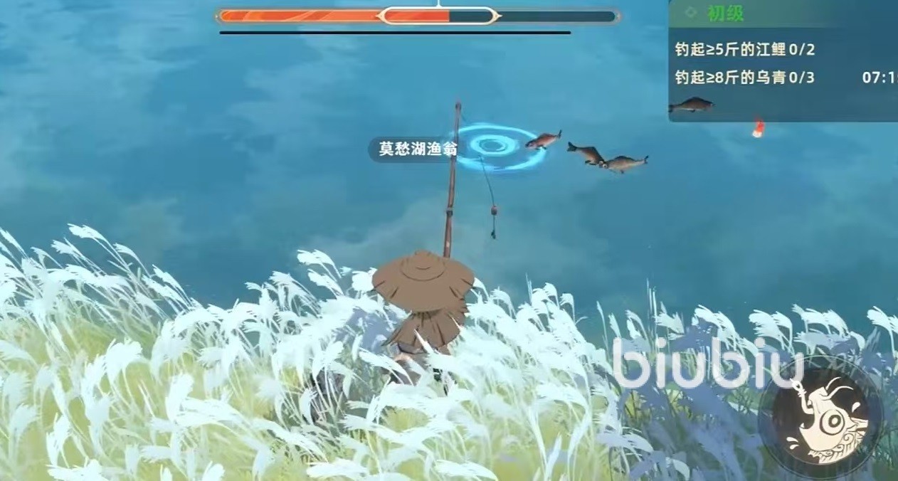 找到地方后直接点击前往,就能自动前去钓鱼。来到鱼塘前和渔夫对话就能开启钓鱼,每个鱼池都有不同等级的钓鱼点,完成当前鱼池的挑战,才能开启下一个钓鱼点挑战,所以说钓鱼其实也相当于是副本闯关玩法,只是不需要战斗。这里所说的挑战就是推出的钓鱼任务,需要在池塘中钓上指定品类的鱼,就可以直接完成了。具体过程就是点击钓鱼按钮,然后朝池塘抛下鱼竿,等待鱼咬钩,接下来就可以开启和鱼进行的拉锯战,界面上方会有进度条,需要将力度维持在方框内,如果力度没有维持在框内,鱼就有几率挣脱。