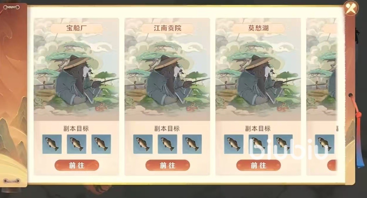想要钓鱼必须先找到鱼塘,然后按照小编接下来的操作介绍就可以了。更多游戏攻略尽在九游专区,九游是手游福利最好的平台,只需要1元就能成为会员,接下来每个月都能拿到无门槛代金券和专属礼包,会员签到还有机会拿PS5,九游是阿里巴巴灵犀互娱旗下大平台,这些福利都有保障。点击游戏中的玩法,在其中找到闲暇界面,里面就有钓鱼、采集、科技等各种休闲活动选项。在这里会给大家推荐可以钓鱼的地点,包括宝船厂、江南贡院、莫愁湖等。不同地点钓到的鱼类也有一些区别,可以直接在副本目标中查看。