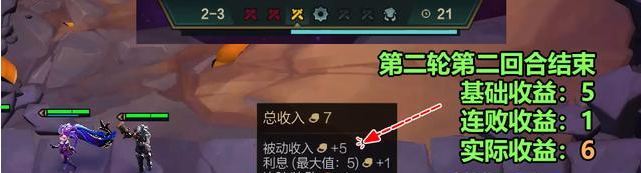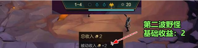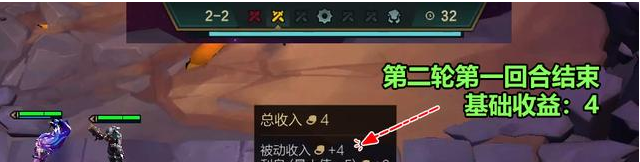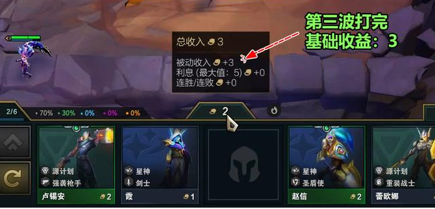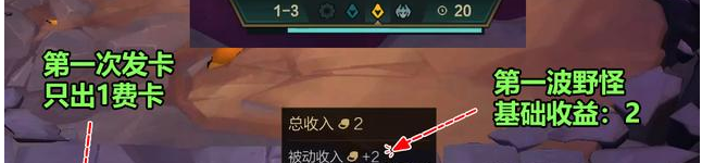 刨除回合选秀环节,打过第2波野怪以后,在第3回合飞哥瞧了一下下收获详细信息,基本收获从5金成为目前的2金了,并且第一回合发牌师只给1费卡!