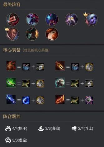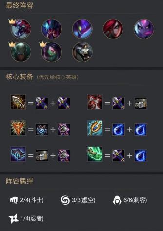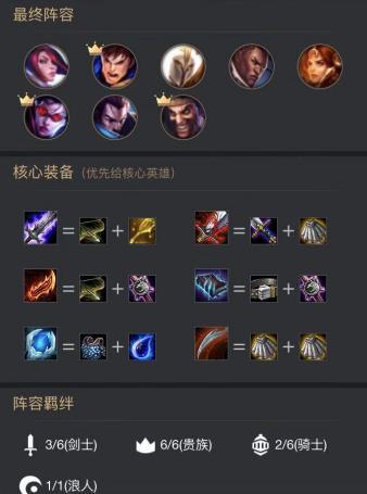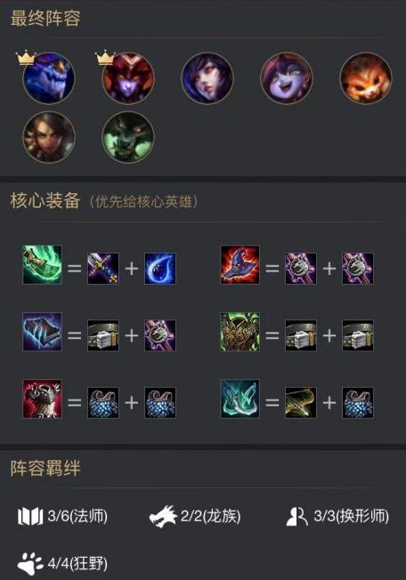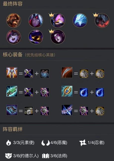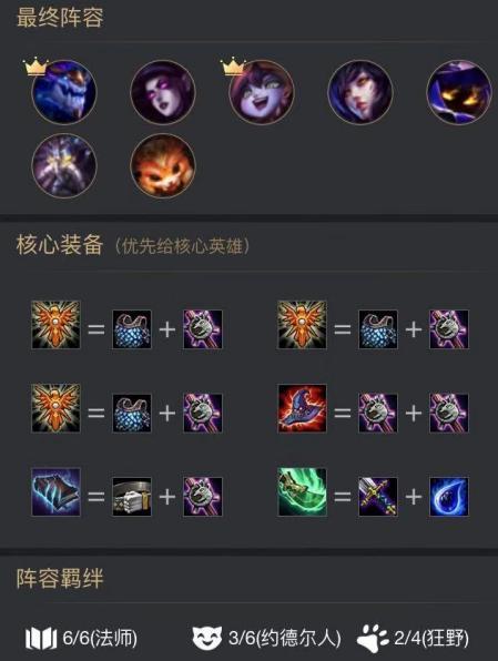 这套阵容的关键是剑魔配复活甲、吸血枪和猫咪,再配上法师羁绊,一斩就能秒人满血。阵容搭配是比较活泛的,能够搭成四恶魔三元素三法、四恶魔三换形三法、四恶魔六法、六恶魔三法等都可以。