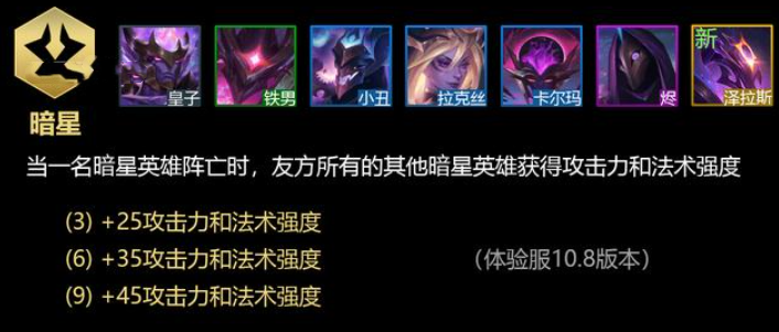 新版暗星各位应当已都在10.7熟悉了,阵亡1个同伴给所有暗星同伴加属性,而10.8版本如同这张图,增添了9暗星,可以加45攻击力和法强。暗星阵容目前增添泽拉斯后,已有7人了,然而离9暗星还差2名,剩余两名只能靠金铲铲来通过职业转换进行填补。游戏中的欧皇小伙伴可以采用9暗星阵容。