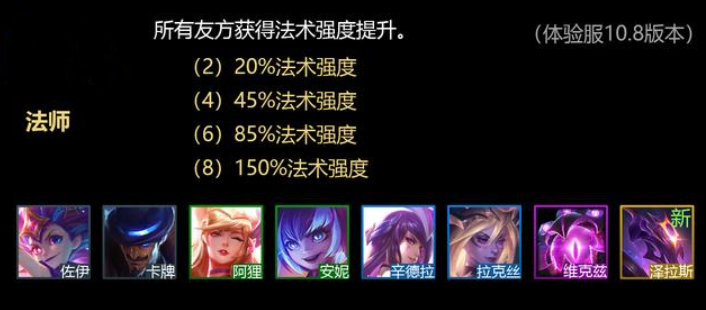 当然,在游戏中不可能每个人都是欧皇,脸黑的玩家还是占绝大多数的,这时候应该怎么办呢?不用急,我们可以采用第二种方式——法师增强。4法师、6法师上调了一些,这是6法二连削以后第1次回调,而暗星法师泽拉斯参加后,目前法师一共来说就有8人了,而官方也在这个时候发布了8法羁绊:整个团队法术强度增添150%!8法是一个不用金铲铲的羁绊,玩家们可以放心大胆地去组这个阵容。但是8法阵容有一个致命的劣质,就是坦度较低,况且橙卡泽拉斯新上线,大家一定会抢泽拉斯,所以可以做4秘术去针对一下。