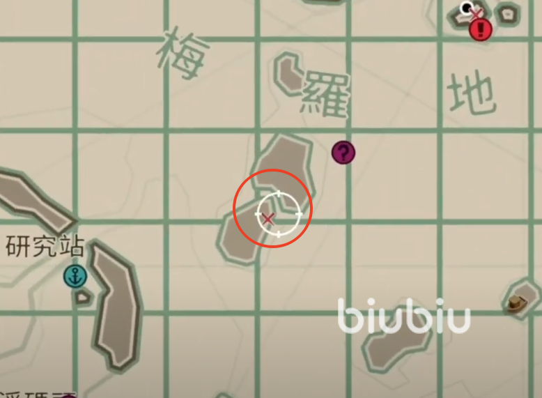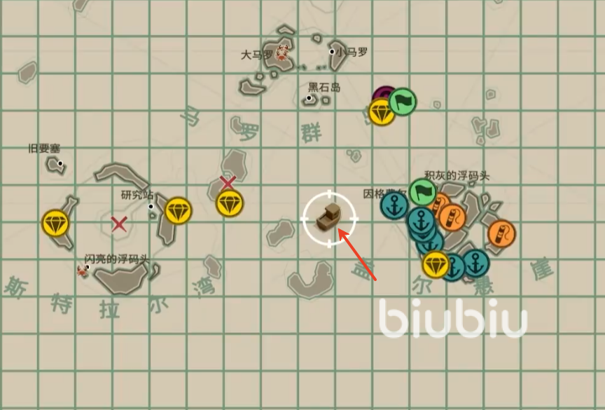 如图所示,这个点位有标记在地图上,大约是在H5和I5之间,刚好可以看到是2个小岛屿之间的狭窄航道。其实这个任务并不难,关键是要看值不值得,这里并不建议大家在夜晚期间特地跑那么远去做这个任务,可以任务先留着,后续到这附近的时候再顺手做一下。