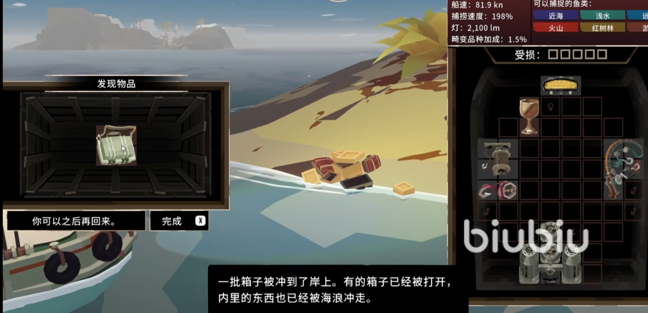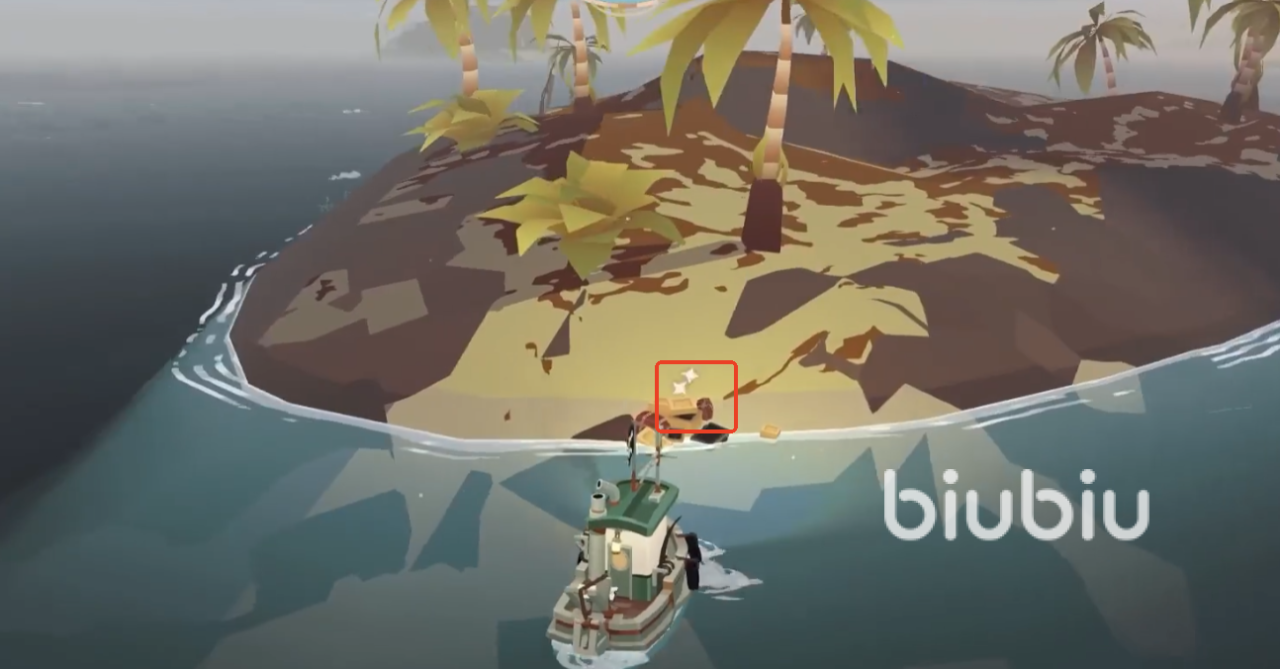 可以看到小岛的岸边有一个闪着光的箱子,将它带上回到之前摄影师的所在地,将其交给这个摄影师,就可以从她那里得到备用照相机,同时解锁技能“镜头”,用它可以拍摄风景。同时与这个摄影师对话还可以了解到附近海域的鱼类分布。