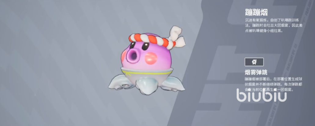 2、蹦蹦烟,拥有可爱小章鱼的外形,将烟雾弹扔出去之后,它会往前弹跳一次,落地和弹跳都会在当前位置生成一团烟雾,可以让角色直接穿过敌人的枪线,将自己的位置转移,使用的时候,还能借助墙壁弹跳。使烟雾获得最大化的覆盖。