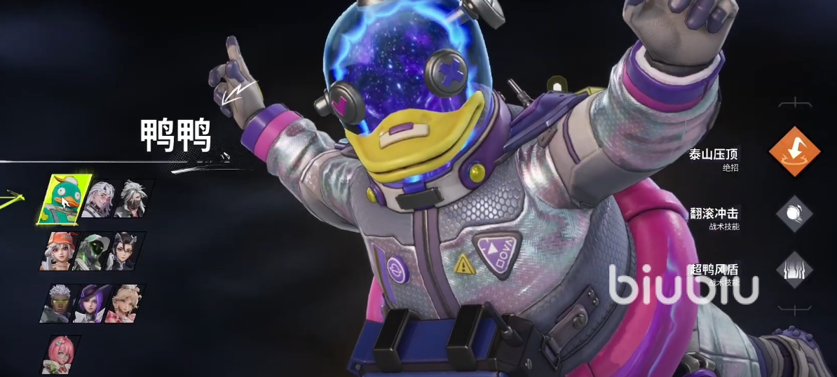 鸭鸭是攻防兼备的英雄,战术技可以让自己化身充气气球发起高速翻滚冲击,进入翻滚一段时间后还会自动换弹,滚动期间有减伤,并且再次使用该技能可以在经过之处生成加速气垫。鸭鸭还能召唤阻挡子弹和投掷物的风盾,在风盾后面自身的恢复速度也会得到加快。鸭鸭的大招泰山压顶则是高高跳起在空中蓄力后向下砸击地面,命中敌人的时候可以获得临时护盾,并且根据砸到的人数减少滚动技能的冷却时间。很明显鸭鸭就是那种适合在前线吸引火力,打乱敌方阵型的英雄。