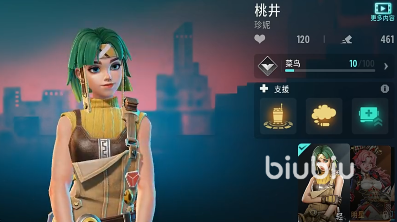 桃井的定位是支援,她的被动技“快速支援”能加快队伍成员修复的速度,从而更快的将队友扶起,她的“烟雾弹”会在指定区域投掷出一个烟雾弹,遮挡敌人的视野,但需要注意自身和队友没有屏蔽遮挡的能力。