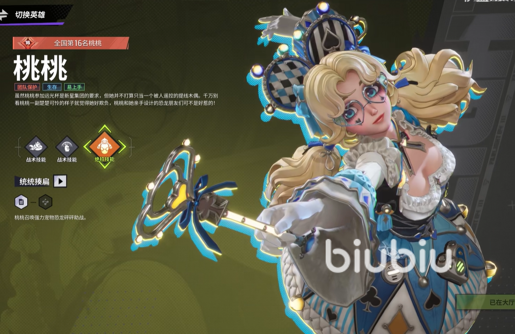 这样小恐龙就可以开始骑乘了,使用飞行能力小恐龙就会升天,此时对面是无法察觉到我方位置的,当处于空中的时候,桃桃可以解除小恐龙的装置,这时候体内的所有人都能释放出来,这样就可以形成有效的空中偷袭,让对面无法进行反制,这也是桃桃大招强势的所在。