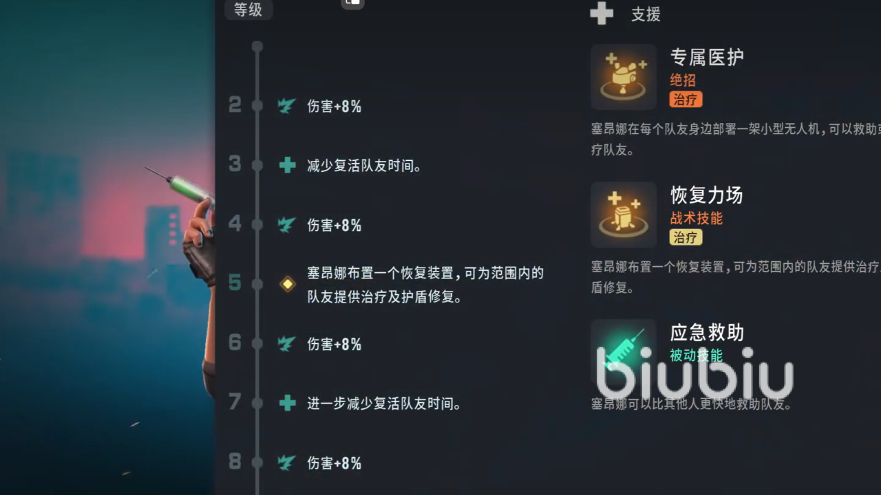 赛昂娜的大招“专属医护”则是团队战中的救命稻草。这项技能释放后,会为技能范围内的所有队友派遣治疗无人机,无人机可以持续治疗并在关键时刻为队友提供救护效果。大招的作用范围和冷却时间随着天赋的提升得到优化,使得赛昂娜能够频繁地为团队提供强力支援。该技能特别适合在激烈的团战中使用,能够有效扭转局势,保证队友的存活率。
