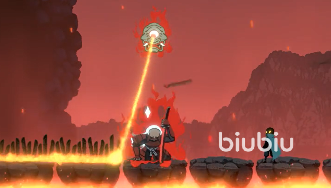在完成解密关卡之后就可以到最后的环节了,与白发鬼武士进行战斗,在游戏中该boos的整体难度还是比较高的,在对战中他会使用快速瞬移等对主角进行攻击,并且在受到一定的伤害之后还会释放激光进行过攻击玩家,玩家在进行对战的时候一定要注意脚下的地板伤害和岩浆伤害。