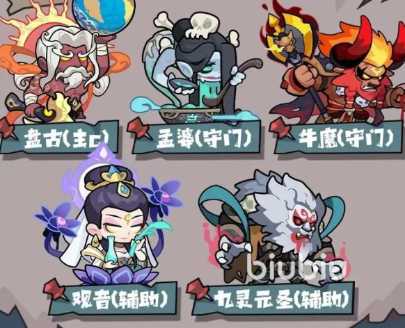 围绕盘古构建的阵容,必须在保护、辅助与增益方面全面兼顾,推荐的搭配:盘古(主C)、孟婆(守门)、牛魔王(守门)、观音(辅助)、九灵元圣(辅助)。孟婆回血支援,使大门能稳住并触发盘古被动增伤。牛魔王前排肉盾加击退。