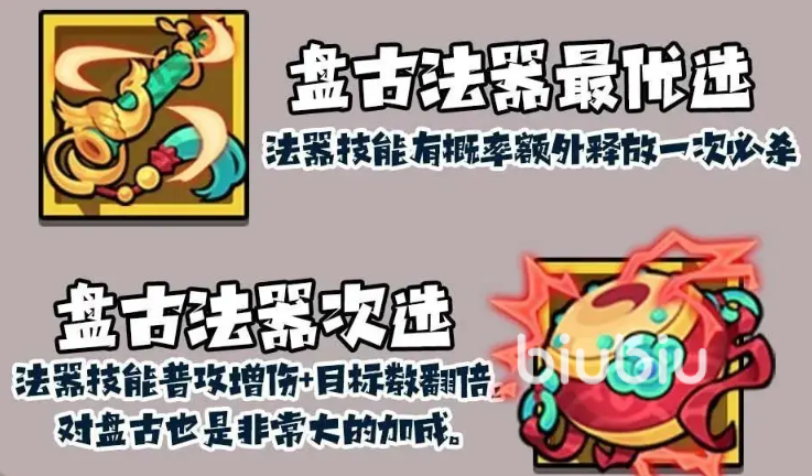 法器与遗物的选择也有影响,盘古最推荐具备概率额外释放必杀技的,其次是增伤类、目标数增加类的。遗物方面,绞肉机、扫帚、小刀、食吸尘器等物理吸血与流血增强型道具则能有效提升团队续航能力。
