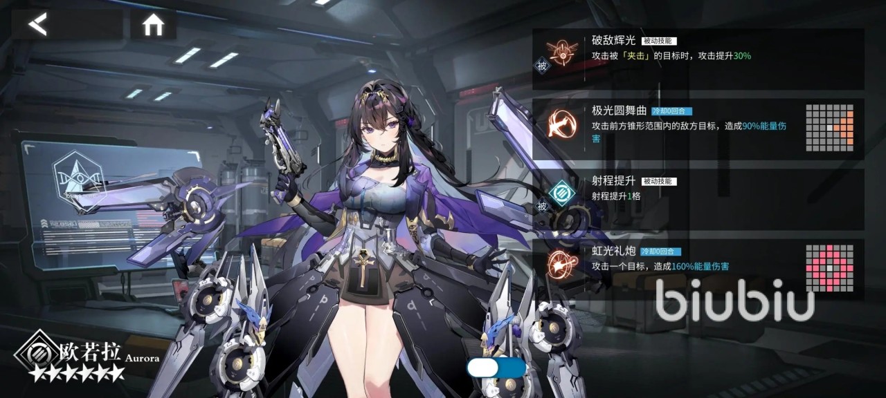 六星中,欧若拉是远程输出角色,操控机甲浮游炮造成能量伤害,黑色长发的经典美少女形象,技能可以对更远处的敌人造成伤害,并且拥有范围伤害,并且在敌人触发夹击debuff时造成更高伤害。鸦和欧若拉属于同定位角色,操控巨大机甲的男性,技能也自带射程提升,以范围攻击为主,并且有让敌人无法闪避的特性,对策性很强。