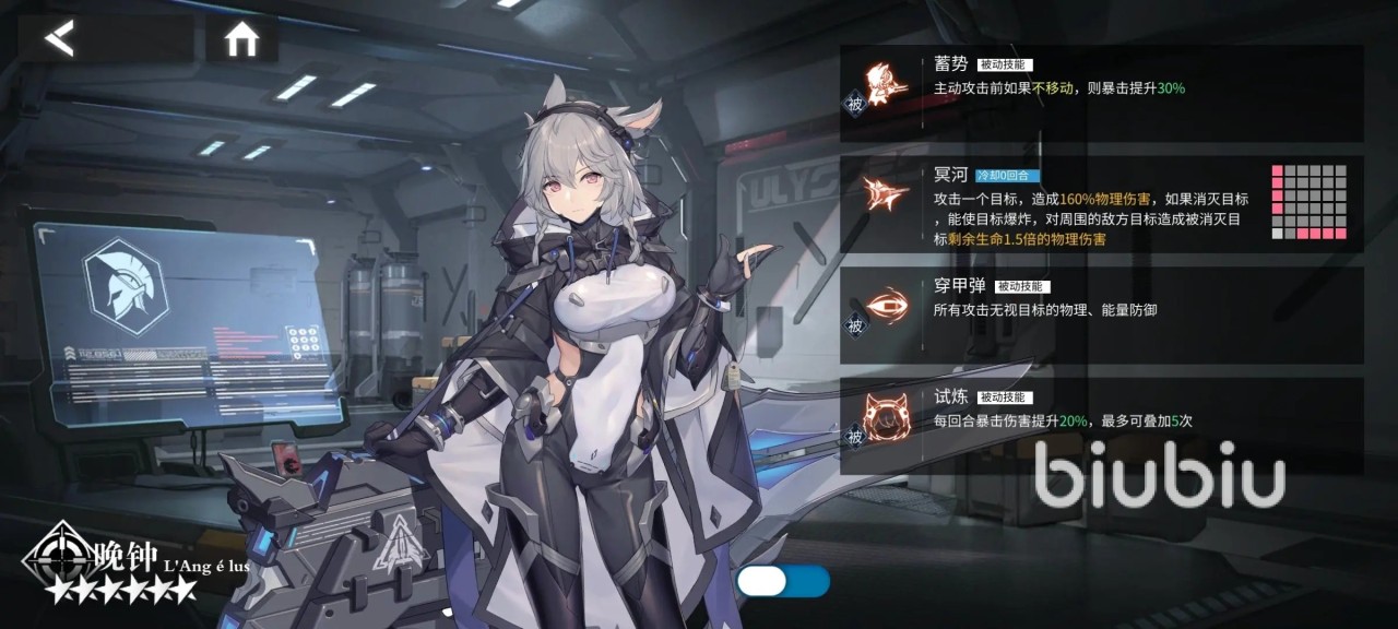 狙击角色晚钟可以在站桩输出的情况下获得更高的暴击率,所以机动性较差,但有不断叠加的暴击率,而且在狙击击杀敌人后可以产生高额爆炸伤害,属于精准点杀型角色,外形上也是带着巨大狙击炮的兽耳娘,反差萌还是比较强烈的。