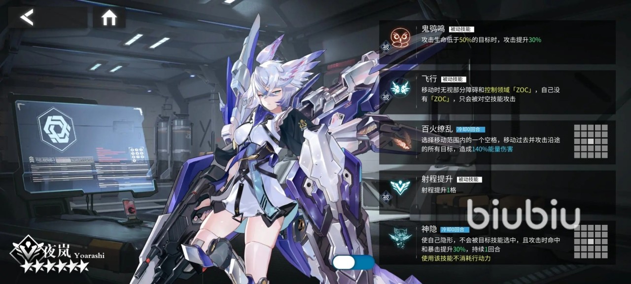 飞行定位角色夜岚,身穿飞行外骨骼,拥有对低血量目标的额外伤害能力,并且飞行定位可以自由穿越地形,拥有隐身暴击技能,类似刺客。
