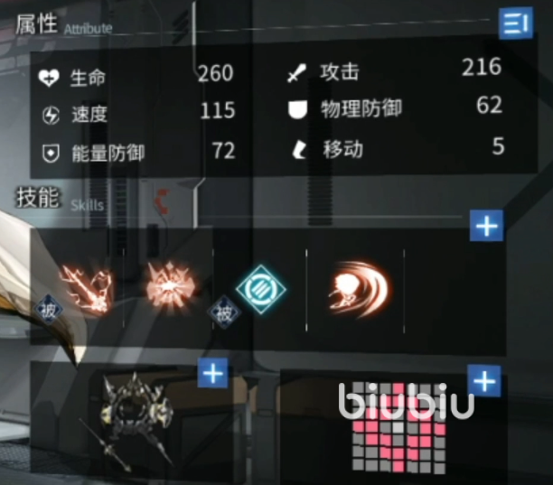 属性和技能上,他的属性很恐怖达到满级之后拥有268的攻击成长153的速度和307的生命值,这种加成让他成为了一个属性怪物,技能上,他的技能伤害很高,他的两个伤害技能的伤害倍率分别是百分之200和百分之140。除此之外他还有两个增益被动,这两个被动可以让他拥有很远的攻击距离,在火力角色当中属他手最长。