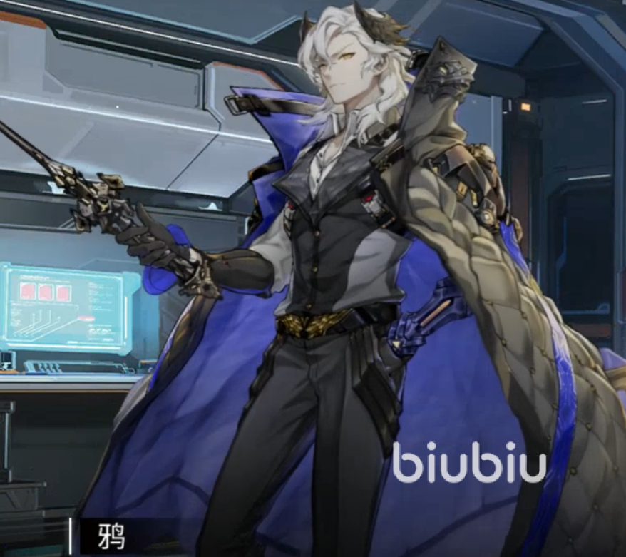 外貌上,鸦是一位拥有白色长发、金色瞳孔、头上带着牛角的帅气男性,他所处阵营是星环科技,是星环科技公司中的一位上位者,他永远操纵雷电的能力,可以使用雷电进行攻击。