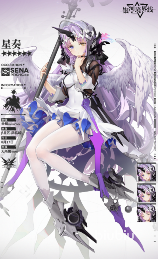 第三位星奏,这位角色来自于凤临城,是凤临城的居民。外貌上,她拥有一头蓝白色的头发一对红色的眼睛,背生白色羽翼,身穿一身白色长裙,手拿一把名为星空之语的法杖,这把法杖是凤临城中的神器。属性上,她的综合属性其实比较低,生命值只有256点攻击只有179点速度也只有160点,就仅看属性成长,她可能还不如一些五星。不过判断一位角色强弱,不能只看属性,还要看技能。技能上,她有一个锁血的被动,一个附带沉默效果的aoe技能以及一个交换位置的技能,这三个技能还是非常好用的,尤其是沉默技能,这个附带沉默的aoe技能只要命中敌方,敌方两回合就会处于挂机状态,在关键对局中这个沉默能起到奇效。