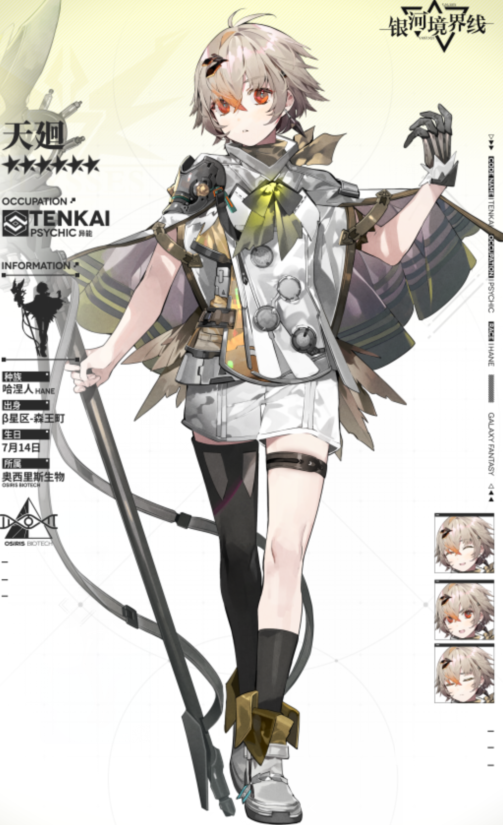 第二位天廻,这是位看起来萌萌的男性角色,他所属于奥西里斯生物公司,是公司中的干部。外貌上,他拥有一浅棕色的短发,身穿奥西里斯生物公司的战斗服,手里拿着一根名为奈落的法杖,能力上他的属性成长相当的惊人,在100级时生命成长达到了307攻击成长达到了140速度成长达到了179,这三个数值在所有六星角色中都是相当高的了。技能上,他拥有一个提升友方单位攻速的光环,还有两个让友方单位在次移动的神级技能,这两个技能可以让友方单位在没用行动力的情况下强行进行移动,在被敌方包围的时候有起效,可以用这个技能让被包围的单位逃出包围圈,除此之外她自身的平a伤害也很高,综合来看她是一位泛用型非常广的异能类角色。