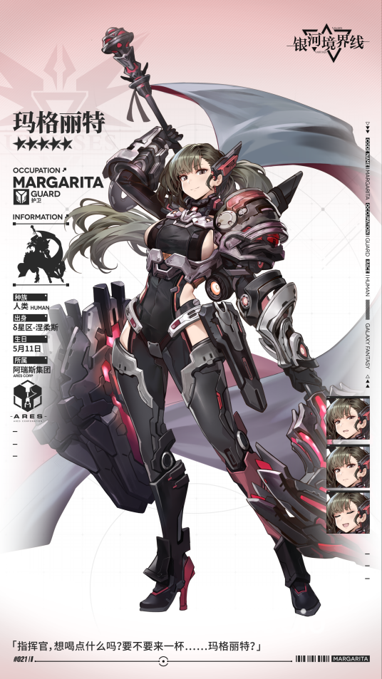 第三位五星护卫角色叫玛格丽特,她拥有三位护卫角色中最高的生命值成长,生命值成长高达468,另外他的攻击速度和物防成长也都不错,分别为120、114、174,不过伴随着这些高属性成长的是他可怜的能量防御成长,他的能量防御成长只有72点,这中防御成长还不如一些输出类型角色,所以从属性上就能判断这是一位只能用于物理队的角色,不能用于能量队。技能上,她的光环技能可以提升友方的防御,第一个被动技能和上面两位一样也可以消耗敌方的行动力,第二个被动技能则可以在自身生命值低于百分之30时自动恢复百分之50的血量,主动技能则可以分摊队友的伤害,综合来看她是物理队中最好用的前排。
