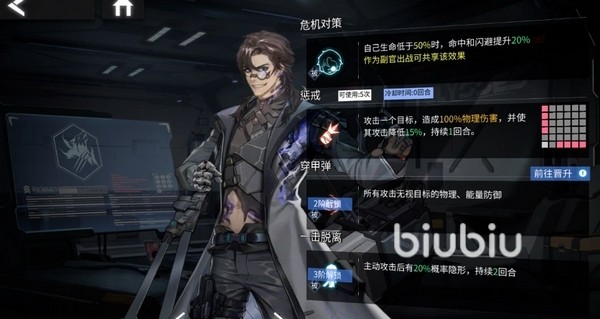 职业天赋攻击能无视双防没什么好说的,被动技能“危机对策”自身半血以下的时候有20%的命中和闪避加成,一个后排狙击加坦度,有点不明所以。然后我们来看看他的主动技能“惩戒”,单体物理伤害,倍率100%不算高,优点在于可以降低敌人15%的攻击力,这个降攻的buff看着很美,但实际战斗中却并不好用。
