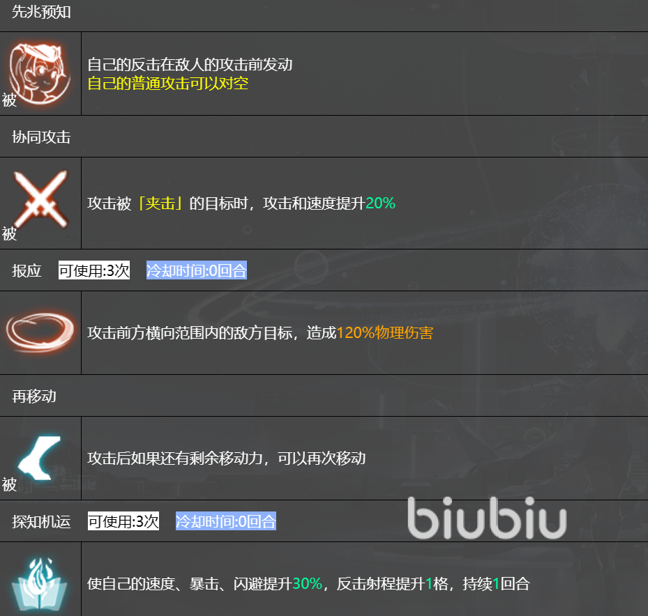 主动技能有3次使用效果,对敌方小范围造成横扫伤害,这个伤害没有任何的附加特效,主要就是平时消耗,大招同样也拥有三次使用机会,没有任何的冷却时间,使用该技能以后角色可以提升暴击,闪避以及速度等属性,这些属性能加快角色的输出节奏,不过只有一回合的生效时间,尽量用于切敌方的核心。